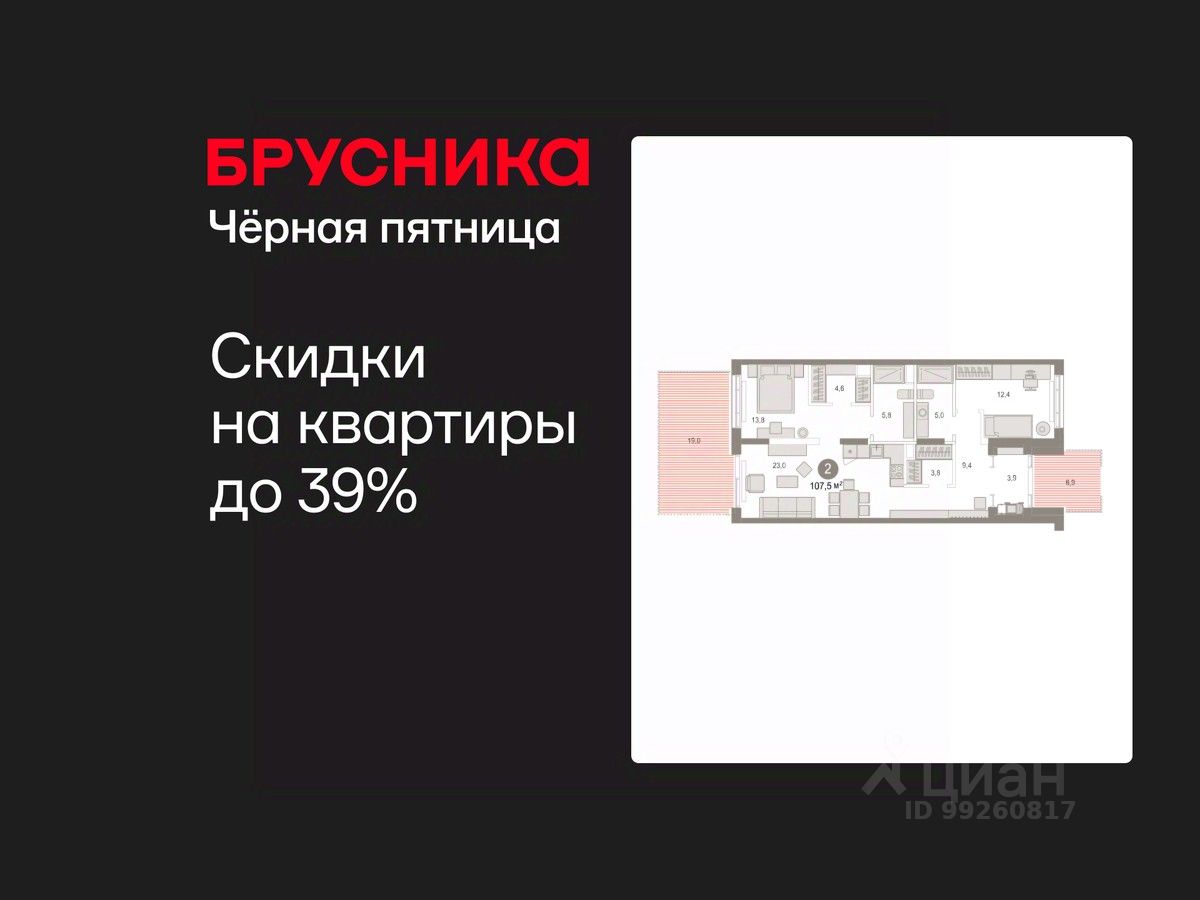 Квартира с кухней-гостиной и двумя спальнями в Октябрьском на Туре. Особенности планировки: гардеробная, окна в пол, без отделки, вид во двор, отдельный вход, панорамное остекление, свободная планировка, разнесённые спальни, мастер-спальня, терраса на крыше.