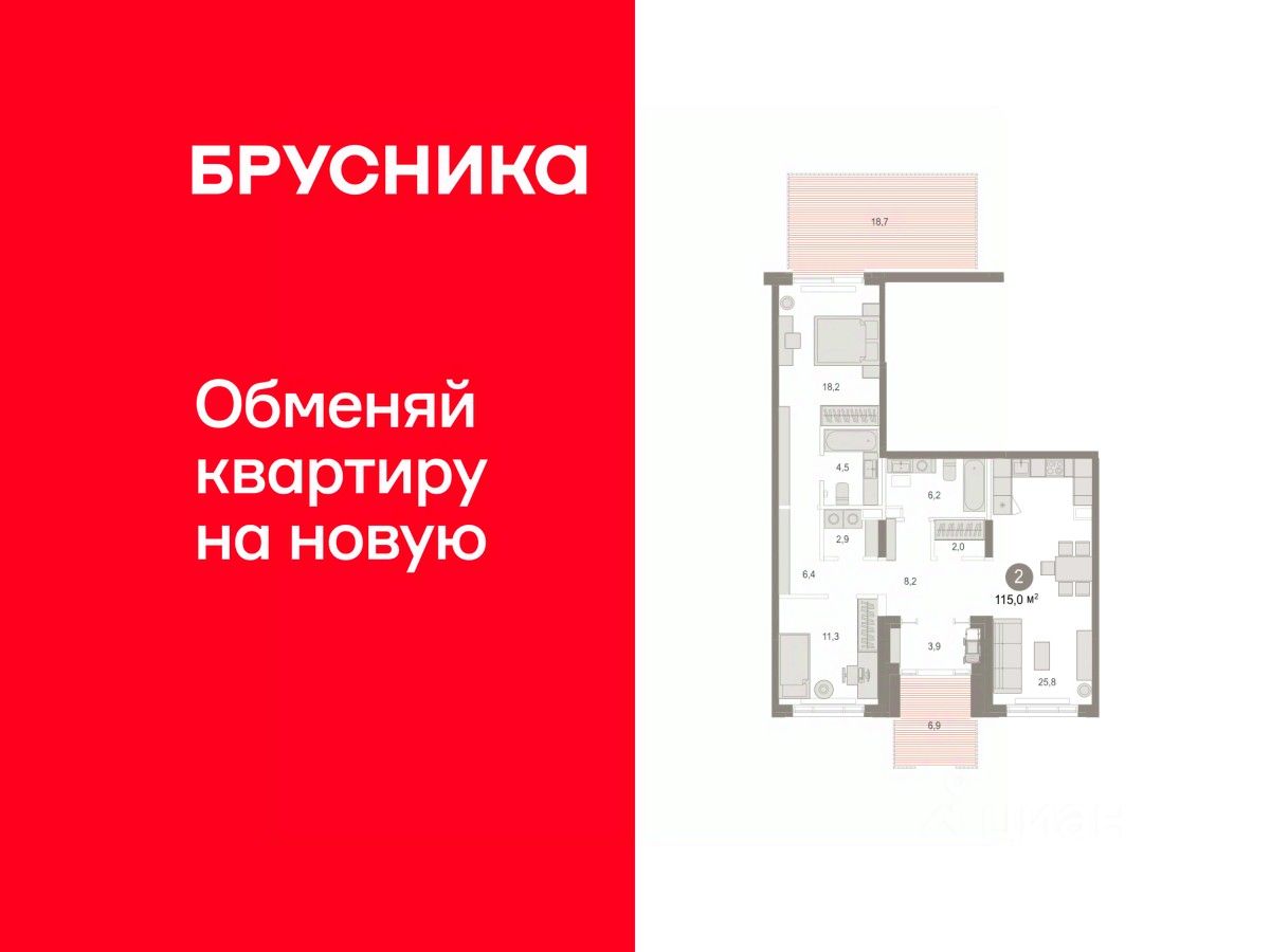 Квартира с кухней-гостиной и двумя спальнями в Октябрьском на Туре. Особенности планировки: вид во двор, гардеробная, мастер-спальня, окна в пол, отдельный вход, панорамное остекление, постирочная, разнесённые спальни, свободная планировка, терраса на крыше.
