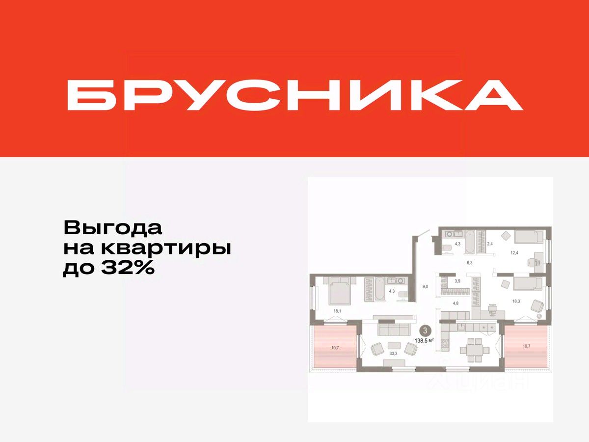 Квартира с кухней-гостиной и тремя спальнями в Октябрьском на Туре. Особенности планировки: гардеробная, без отделки, вид во двор, свободная планировка, разнесённые спальни, мастер-спальня, терраса на крыше.