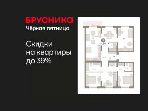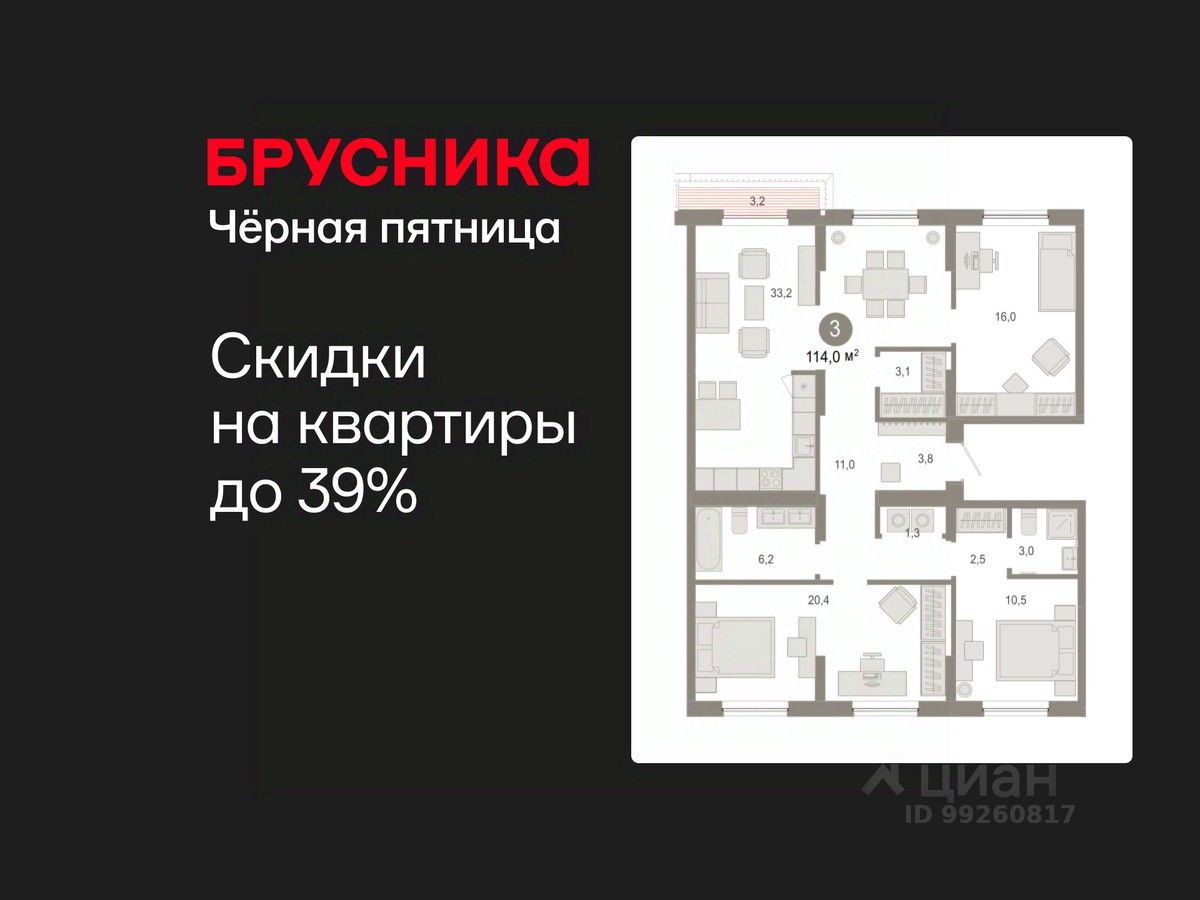 Квартира с кухней-гостиной и тремя спальнями в Октябрьском на Туре. Особенности планировки: гардеробная, вид во двор, разнесённые спальни, предчистовая отделка, мастер-спальня, постирочная, терраса на крыше.