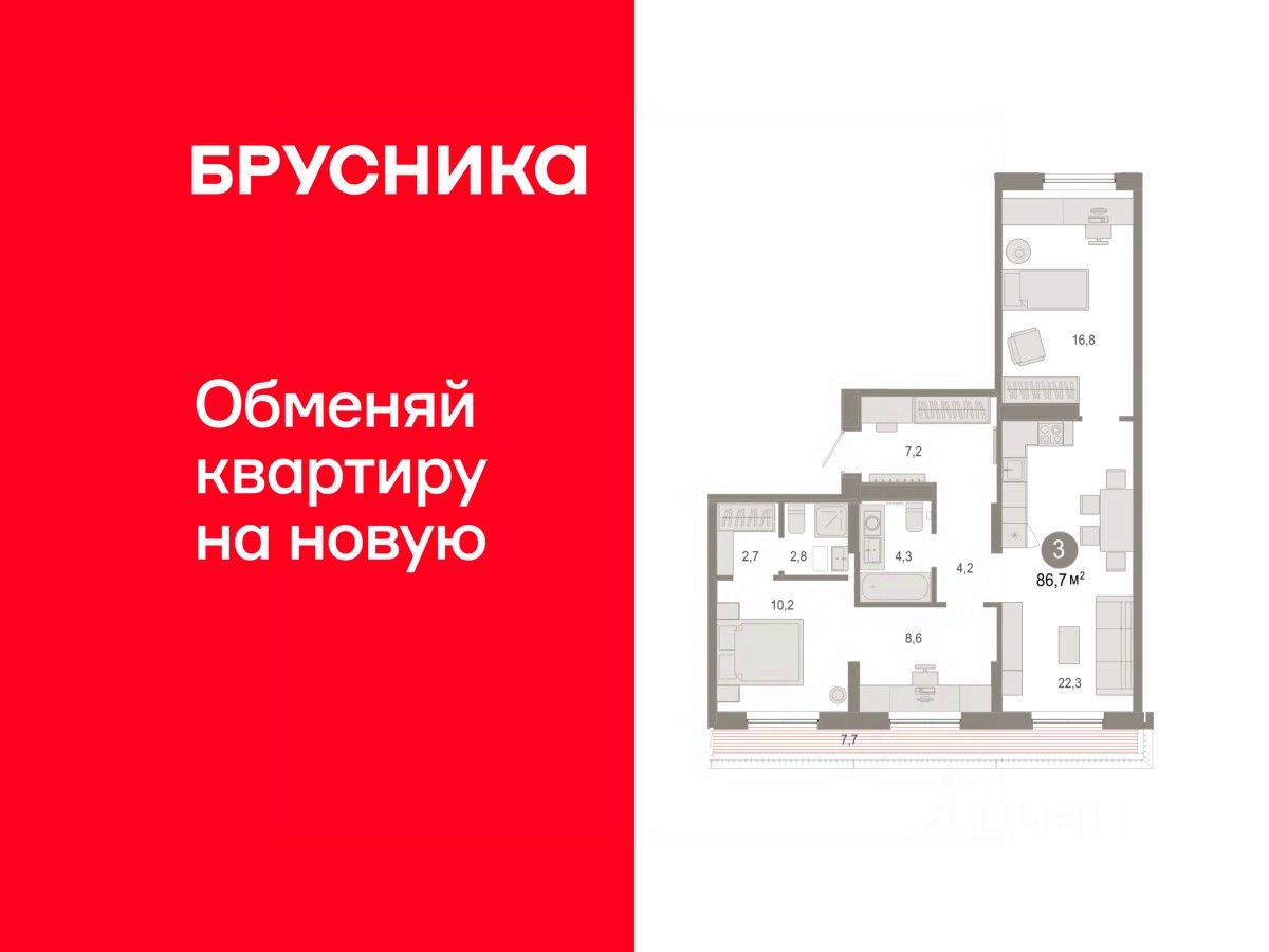 Квартира с кухней-гостиной и тремя спальнями в Октябрьском на Туре. Особенности планировки: предчистовая отделка, рабочий кабинет, разнесённые спальни, терраса на крыше.