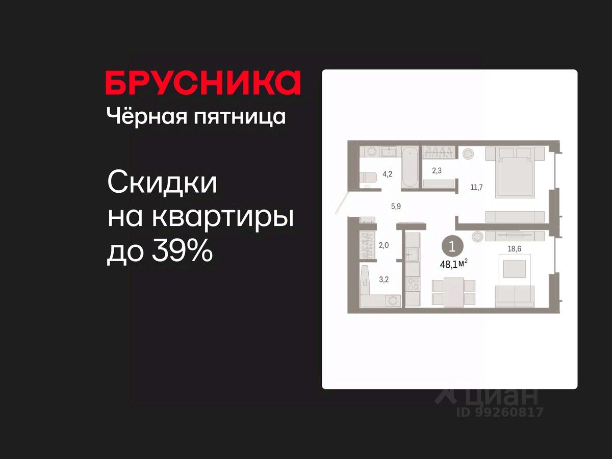1-комн. квартира с предчистовой отделкой в ЖК "Республики 205" на 12 этаже. Общая площадь: 48.06 кв.м., жилая: 11.7 кв.м., площадь просторной кухни-гостиной: 18.6 кв.м. Все окна выходят на одну сторону. В квартире один совмещенный санузел. Высота потолков 2.7 м.