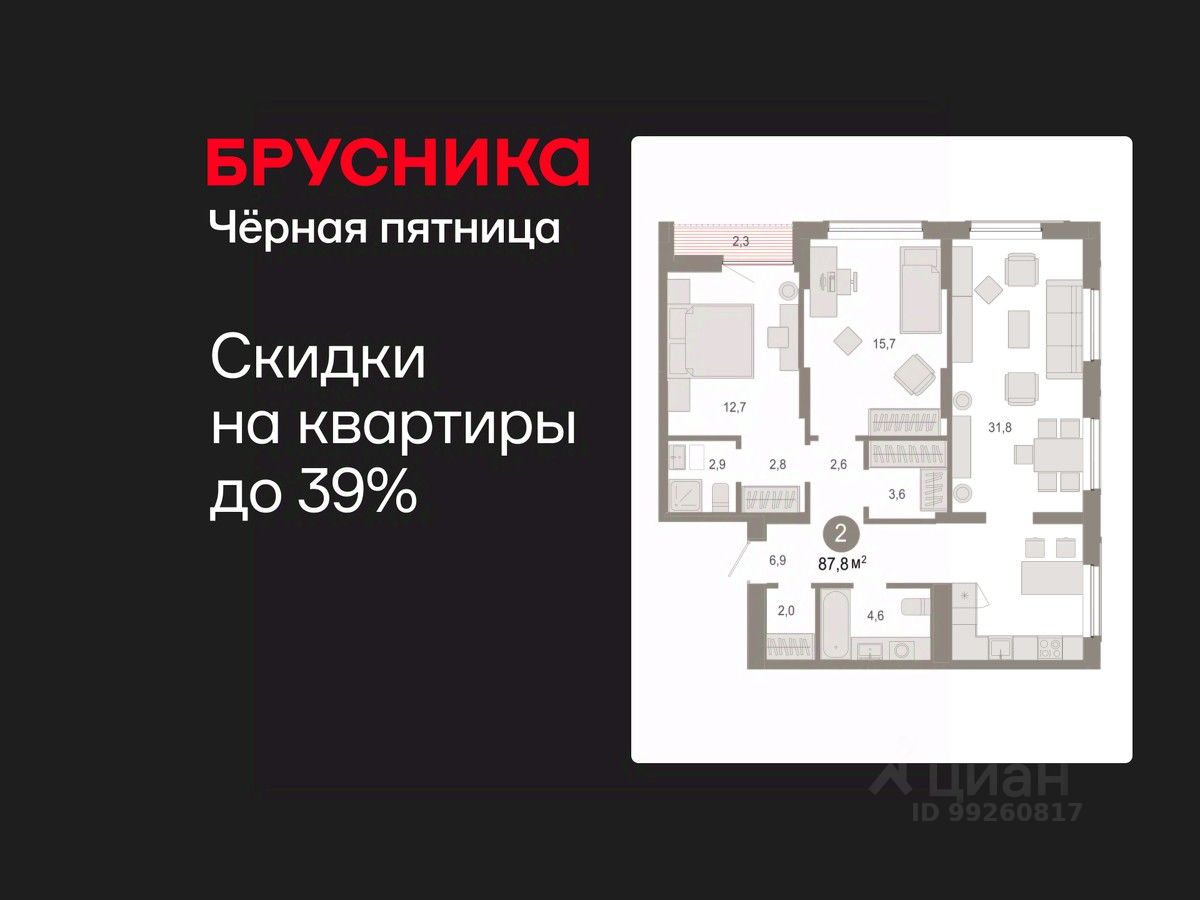 Квартира с кухней-гостиной и двумя спальнями в Октябрьском на Туре. Особенности планировки: гардеробная, вид во двор, лоджия, предчистовая отделка, мастер-спальня.