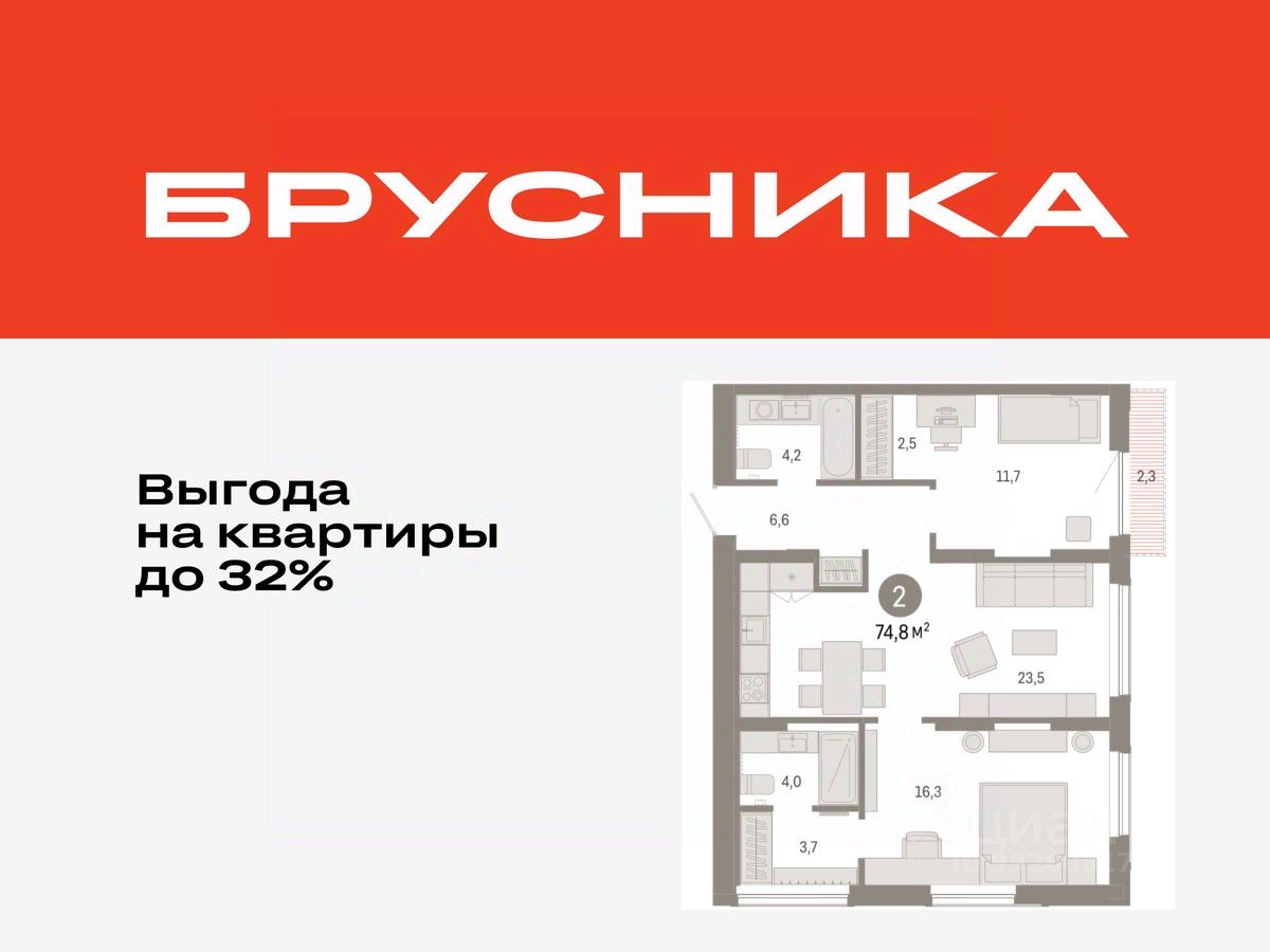 Квартира с кухней-гостиной и двумя спальнями в Октябрьском на Туре. Особенности планировки: гардеробная, вид во двор, разнесённые спальни, предчистовая отделка, мастер-спальня, балкон.