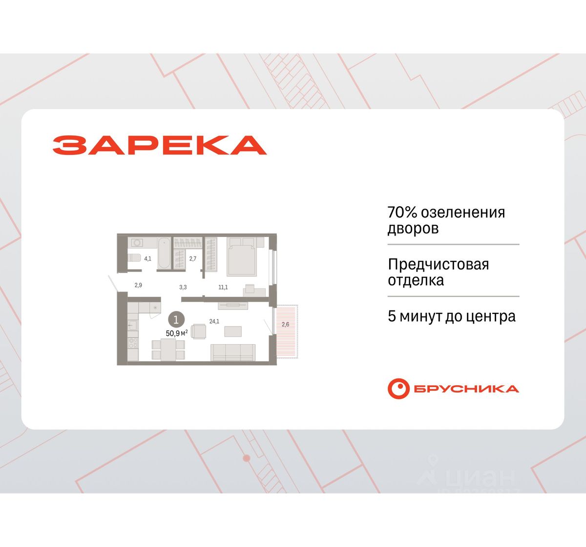 1-комн. квартира от застройщика с предчистовой отделкой в ЖК "Зарека" на 5 этаже. Общая площадь: 50.87 кв.м., жилая: 11.1 кв.м., площадь просторной кухни-гостиной: 24.1 кв.м. Все окна выходят на одну сторону. В квартире один балкон, один совмещенный санузел. Высота потолков 2.7 м.
