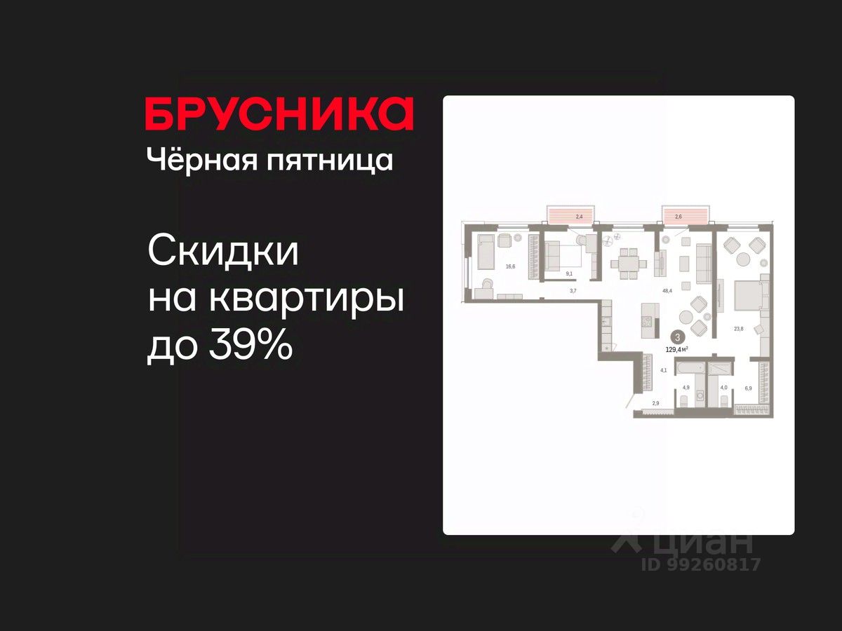 Продается трехкомнатная квартира с предчистовой отделкой в ЖК "Зарека" на 6 этаже. Общая площадь: 129.42 кв.м., жилая: 49.5 кв.м., площадь просторной кухни-гостиной: 48.4 кв.м. Квартира угловая, окна oбecпeчивaют paвнoмepнoe ocвeщeниe в тeчeниe дня. В квартире два балкона, два совмещенных санузла. Высота потолков 2.7 м.