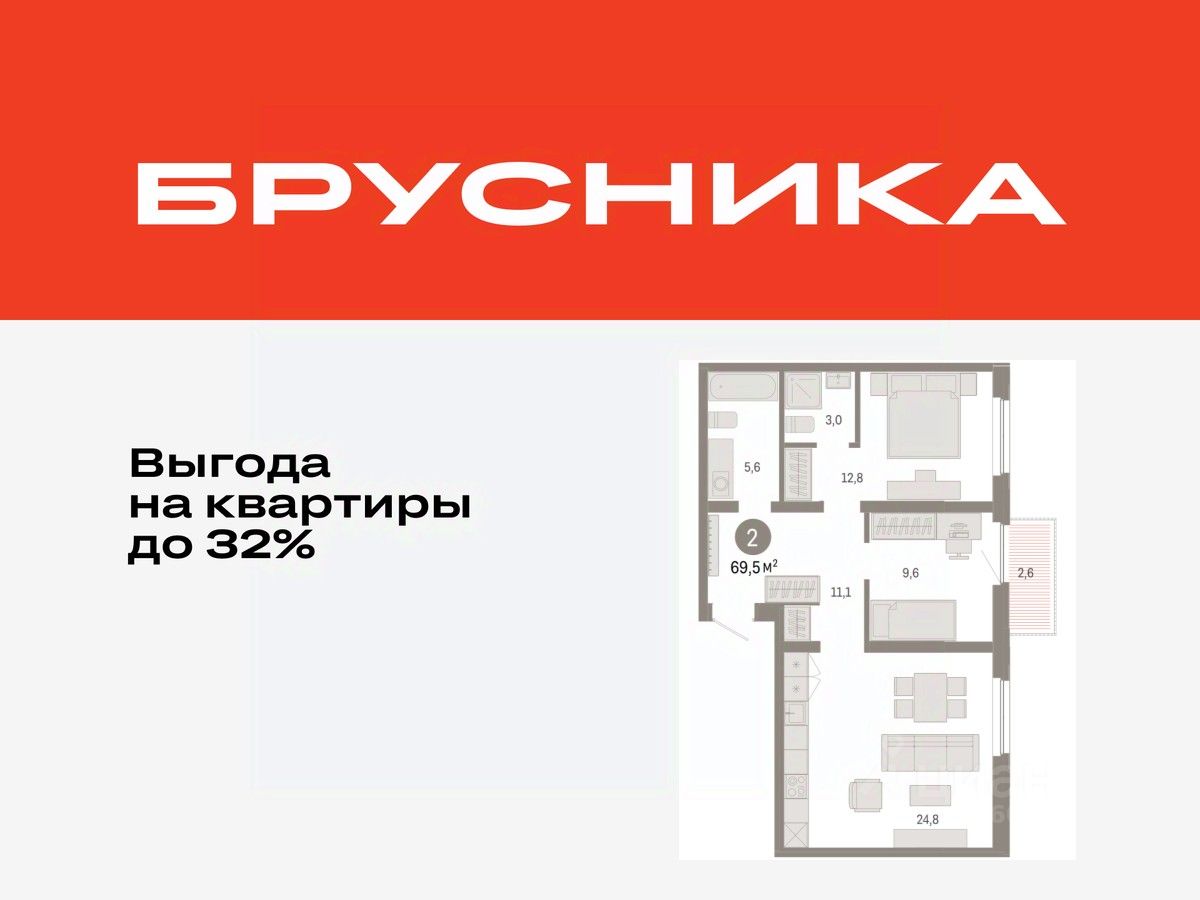 Квартира с кухней-гостиной и двумя спальнями в жилом районе "Зарека". Особенности планировки: предчистовая отделка, мастер-спальня, балкон.