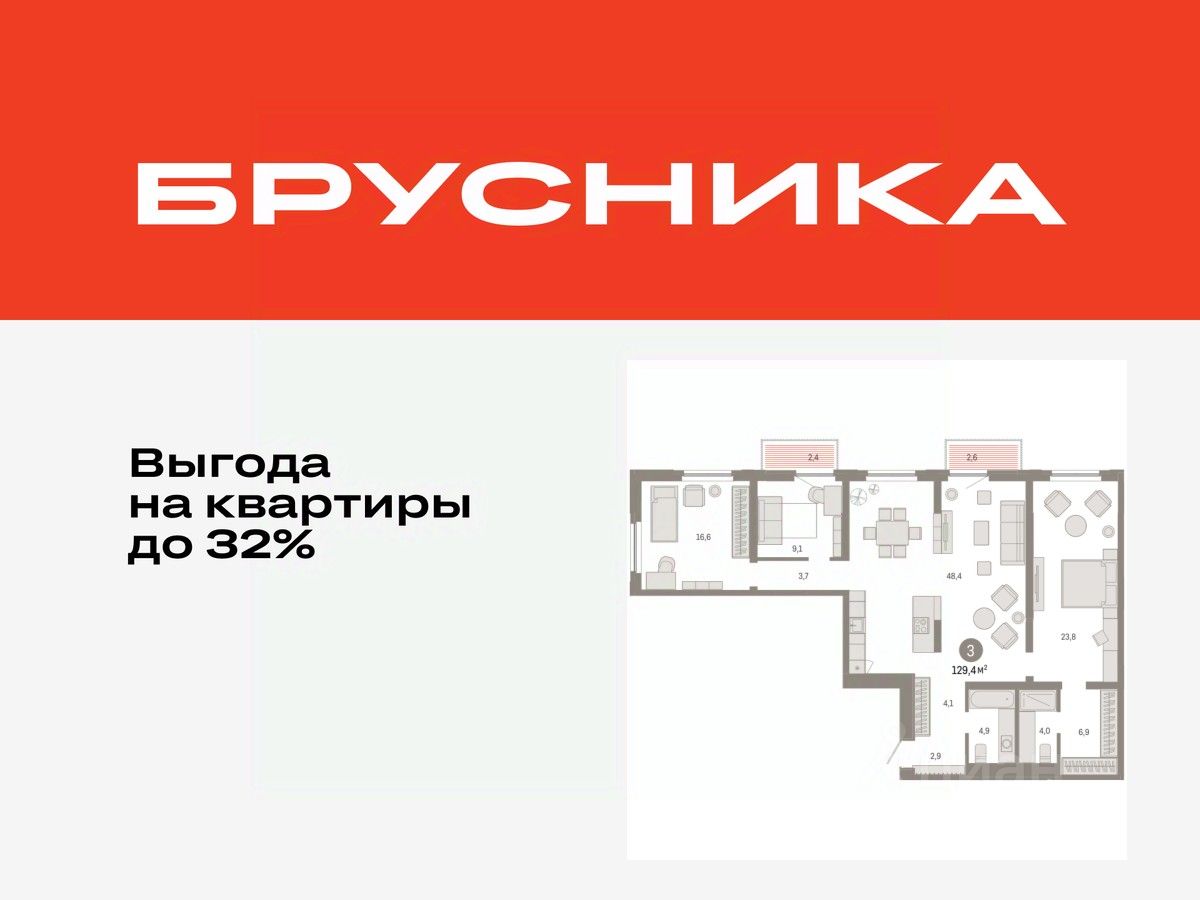 Квартира с кухней-гостиной и тремя спальнями в жилом районе "Зарека". Особенности планировки: гардеробная, разнесённые спальни, предчистовая отделка, мастер-спальня, балкон.