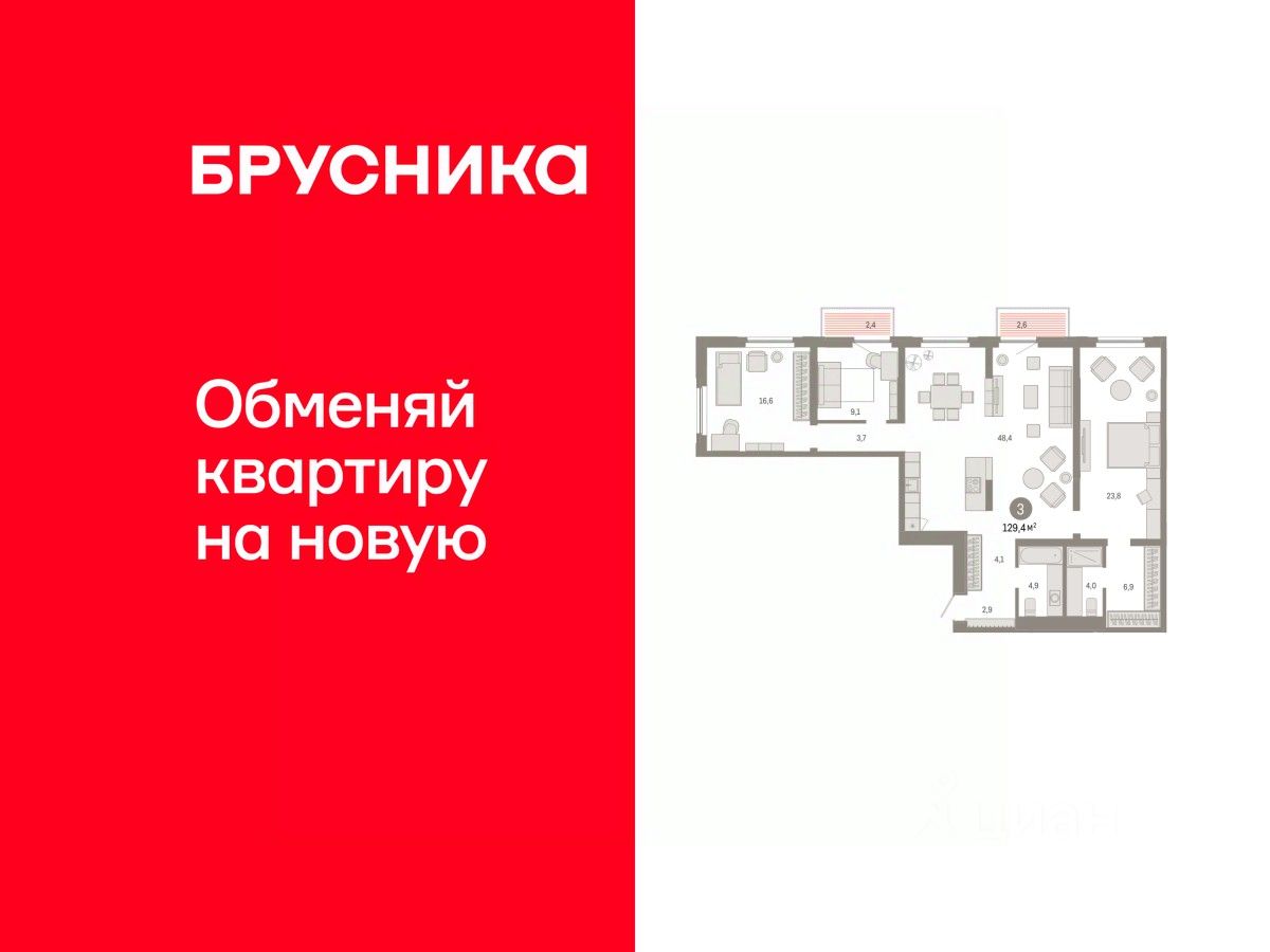 Просторная 3-комн. квартира с предчистовой отделкой в ЖК "Зарека" на 10 этаже. Общая площадь: 129.44 кв.м., жилая: 49.5 кв.м., площадь просторной кухни-гостиной: 48.4 кв.м. Квартира угловая, идеально подойдет любителям тишины и панорамных видов. В квартире два балкона, два совмещенных санузла. Высота потолков 2.7 м.