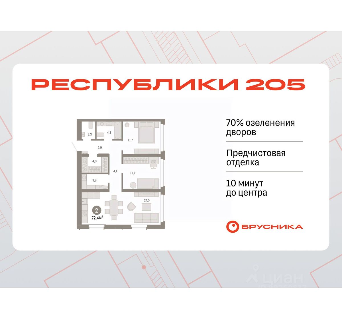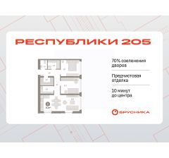 Двухкомнатная квартира с предчистовой отделкой в ЖК "Республики 205" на 12 этаже. Общая площадь: 72.39 кв.м., жилая: 23.4 кв.м., площадь просторной кухни-гостиной: 24.5 кв.м. Угловая квартира, очень светлая, естественная вентиляция при открытии окон. В квартире один совмещенный и один раздельный санузел. Высота потолков 2.7 м.