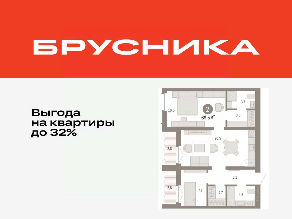 Двухкомнатная квартира с предчистовой отделкой в ЖК "Республики 205" на 7 этаже. Общая площадь: 69.47 кв.м., жилая: 23.1 кв.м., площадь просторной кухни-гостиной: 20.5 кв.м. Комнаты изолированные, все окна выходят на одну сторону. В квартире две лоджии, два совмещенных санузла. Высота потолков 2.7 м.