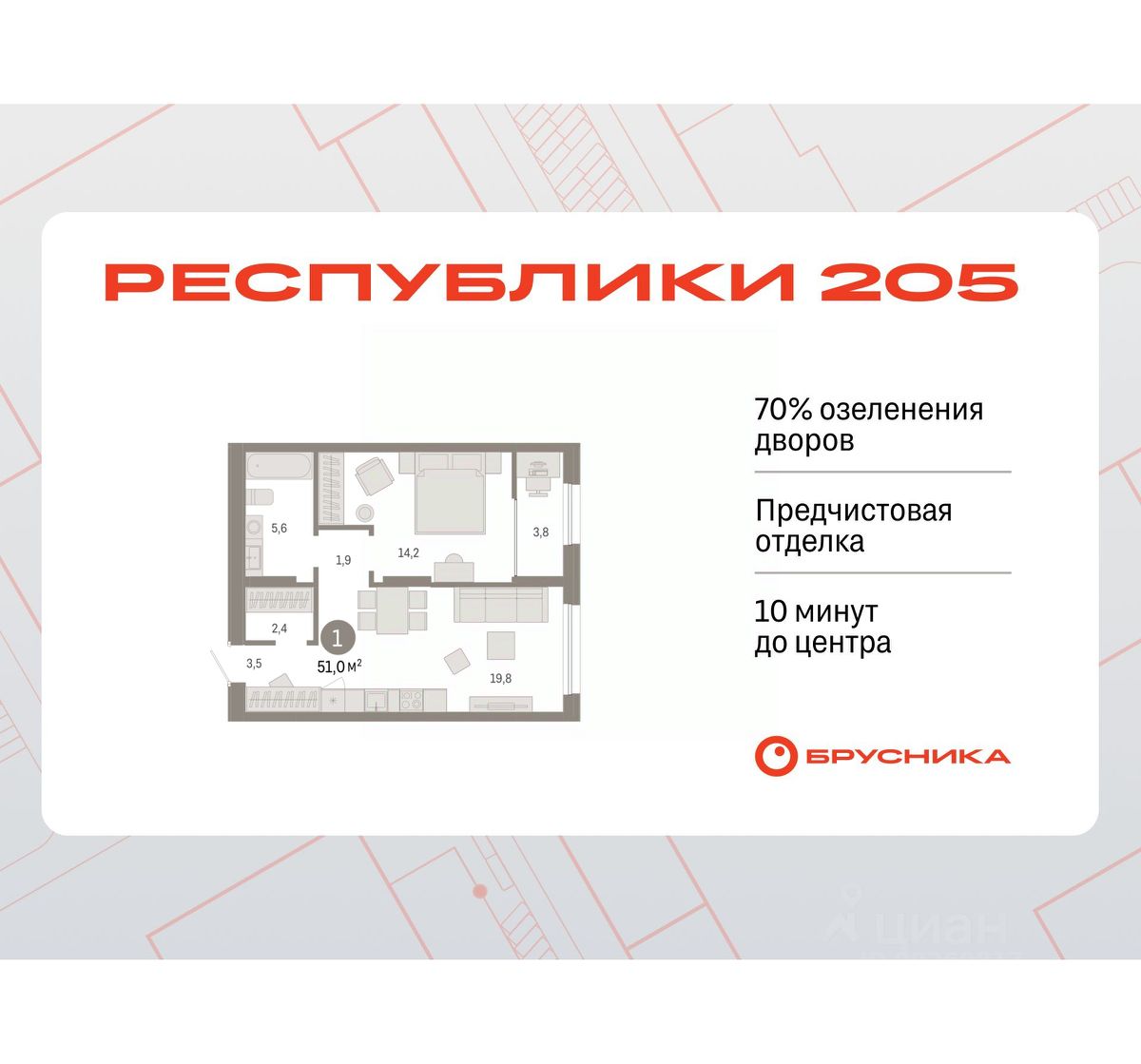 1-комн. квартира с предчистовой отделкой в ЖК "Республики 205" на 16 этаже. Общая площадь: 51.04 кв.м., жилая: 14.2 кв.м., площадь просторной кухни-гостиной: 19.8 кв.м. Все окна выходят на одну сторону. В квартире одна лоджия, один совмещенный санузел. Высота потолков 2.6 м.