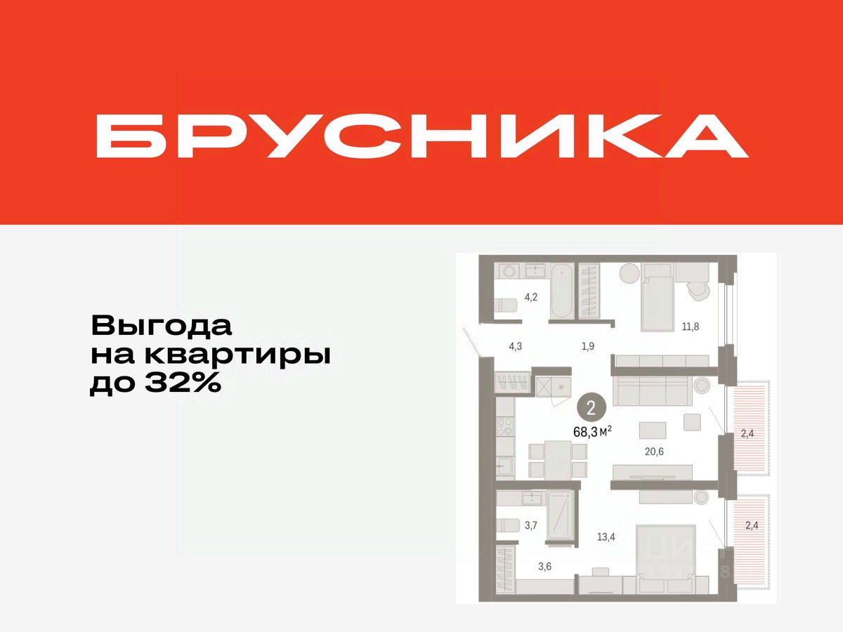 Просторная 2-комн. квартира с предчистовой отделкой в ЖК "Зарека" на 2 этаже. Общая площадь: 68.33 кв.м., жилая: 25.2 кв.м., площадь просторной кухни-гостиной: 20.6 кв.м. Комнаты изолированные, все окна выходят на одну сторону. В квартире два балкона, два совмещенных санузла. Высота потолков 2.7 м.