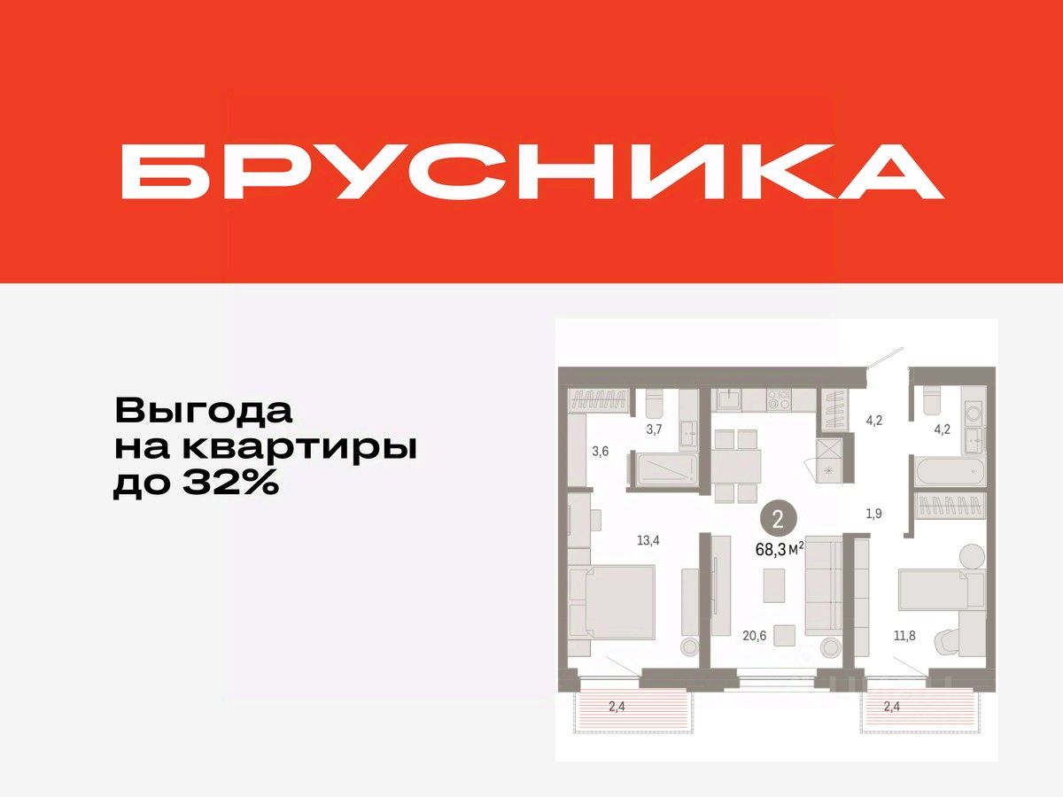 Продается двухкомнатная квартира от застройщика с предчистовой отделкой в ЖК "Зарека" на 3 этаже. Общая площадь: 68.27 кв.м., жилая: 25.2 кв.м., площадь просторной кухни-гостиной: 20.6 кв.м. Комнаты изолированные, все окна выходят на одну сторону. В квартире два балкона, два совмещенных санузла. Высота потолков 2.7 м.