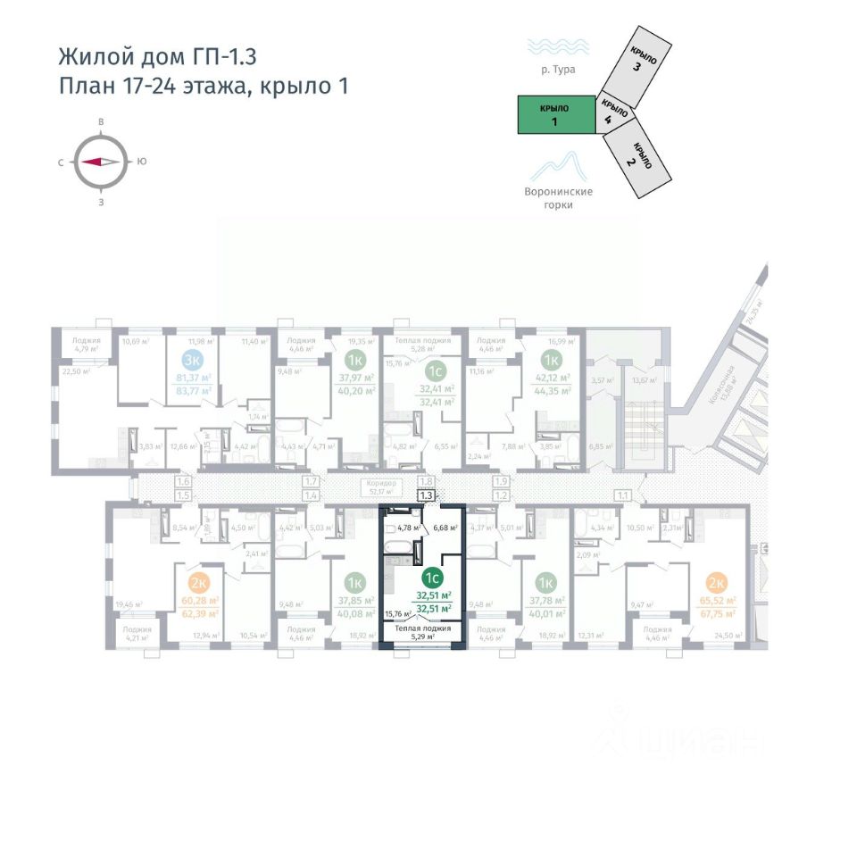 Предлагаем 1 - комнатную квартиру в доме ГП-1.3 общей площадью: 32,51 кв.м., с типом планировки: Студия. Комплекс расположен на территории бывшего завода "ДОК "Красный Октябрь. Это один из самых зеленых и чистых уголков города: здесь нет шумных магистралей и предприятий. До центра всего 2,5 км без мостов и путепроводов, а значит, вы можете спланировать время на дорогу с точностью до минуты. Дома стоят на высоком берегу Туры, на первой линии у воды. С территории ЖК хорошо просматриваются как панорама реки, так исторический центр, Мост Влюбленных и набережная. Проектирование ЖК выполнил архитектор Лазар Герич (Сербия). Из особых фишек проекта 9 лифтов на один дом, колясочные на каждом этаже, зоны ожидания и стойка консьержа в холле. Дворовая территория с игровыми и спортивными площадками - закрытая. Машино-места в комплексе бесплатные, общее число для дома первой очереди 642.
