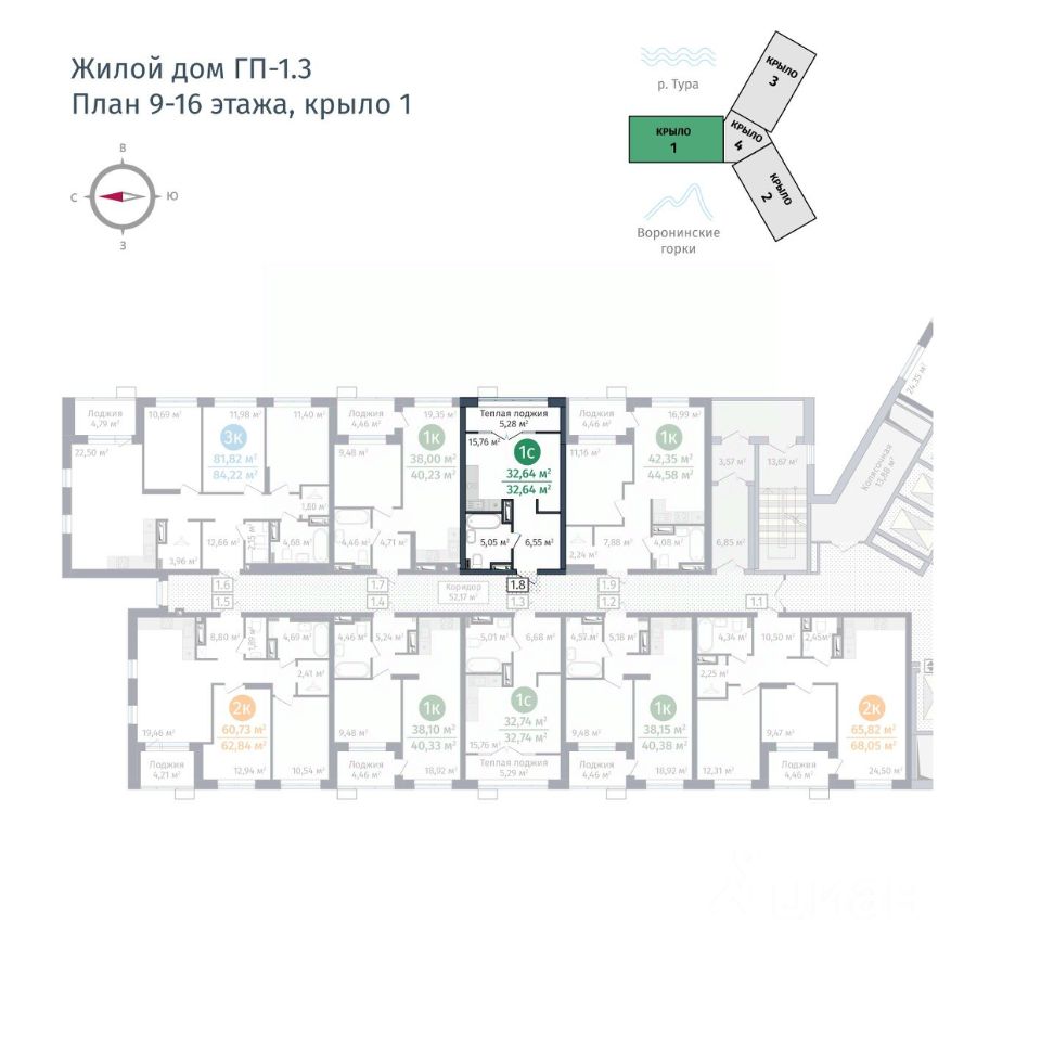 Предлагаем 1 - комнатную квартиру в доме ГП-1.3 общей площадью: 32,64 кв.м., с типом планировки: Студия. Комплекс расположен на территории бывшего завода "ДОК "Красный Октябрь. Это один из самых зеленых и чистых уголков города: здесь нет шумных магистралей и предприятий. До центра всего 2,5 км без мостов и путепроводов, а значит, вы можете спланировать время на дорогу с точностью до минуты. Дома стоят на высоком берегу Туры, на первой линии у воды. С территории ЖК хорошо просматриваются как панорама реки, так исторический центр, Мост Влюбленных и набережная. Проектирование ЖК выполнил архитектор Лазар Герич (Сербия). Из особых фишек проекта 9 лифтов на один дом, колясочные на каждом этаже, зоны ожидания и стойка консьержа в холле. Дворовая территория с игровыми и спортивными площадками - закрытая. Машино-места в комплексе бесплатные, общее число для дома первой очереди 642.