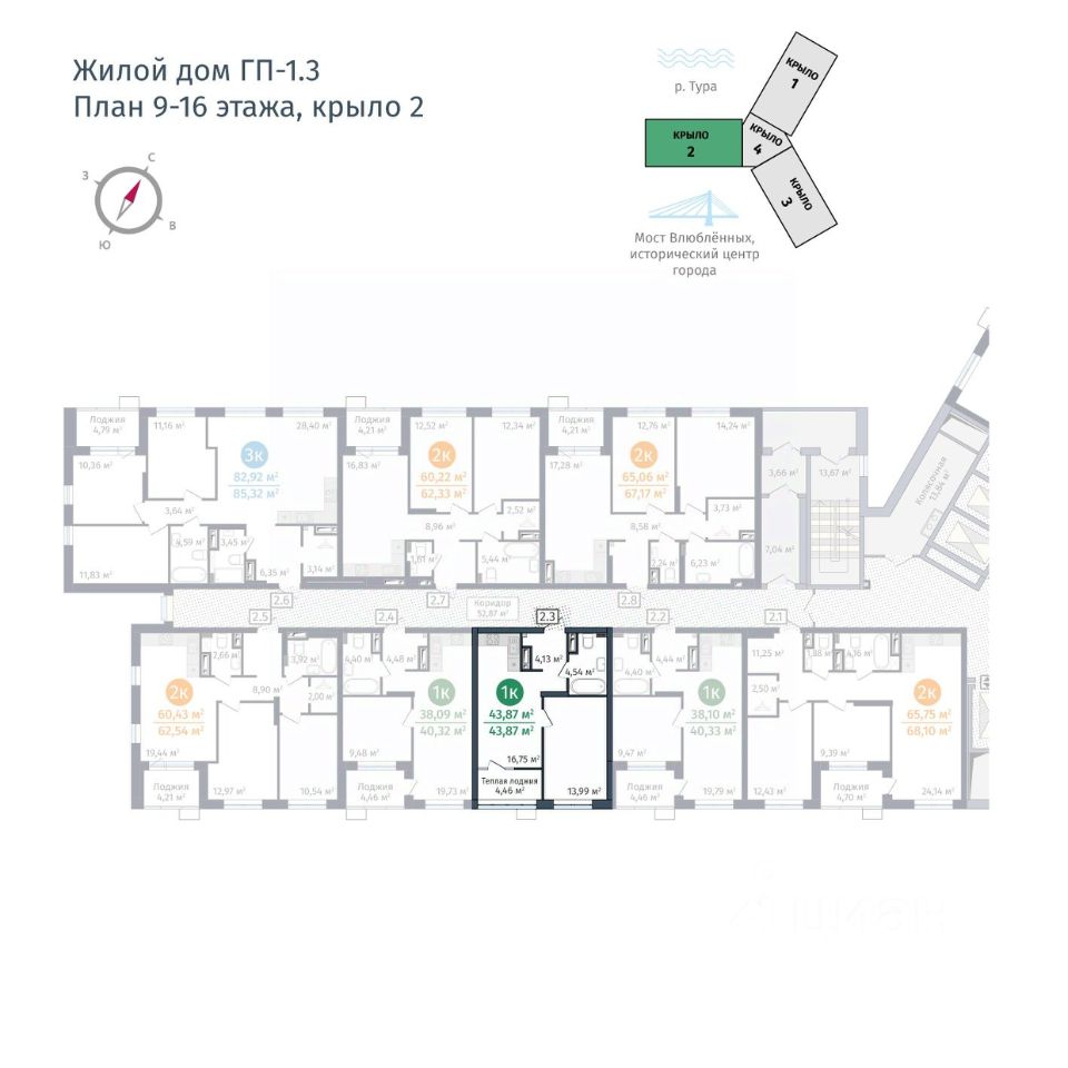 Предлагаем 1 - комнатную квартиру в доме ГП-1.3 общей площадью: 43,87 кв.м., с типом планировки: Кухня-гостиная. Комплекс расположен на территории бывшего завода "ДОК "Красный Октябрь. Это один из самых зеленых и чистых уголков города: здесь нет шумных магистралей и предприятий. До центра всего 2,5 км без мостов и путепроводов, а значит, вы можете спланировать время на дорогу с точностью до минуты. Дома стоят на высоком берегу Туры, на первой линии у воды. С территории ЖК хорошо просматриваются как панорама реки, так исторический центр, Мост Влюбленных и набережная. Проектирование ЖК выполнил архитектор Лазар Герич (Сербия). Из особых фишек проекта 9 лифтов на один дом, колясочные на каждом этаже, зоны ожидания и стойка консьержа в холле. Дворовая территория с игровыми и спортивными площадками - закрытая. Машино-места в комплексе бесплатные, общее число для дома первой очереди 642.