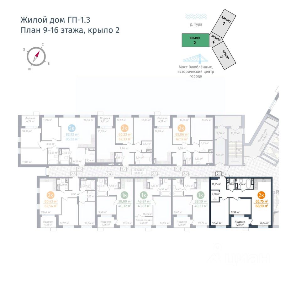 Предлагаем 2 - комнатную квартиру в доме ГП-1.3 общей площадью: 65,75 кв.м., с типом планировки: Кухня-гостиная. Комплекс расположен на территории бывшего завода "ДОК "Красный Октябрь. Это один из самых зеленых и чистых уголков города: здесь нет шумных магистралей и предприятий. До центра всего 2,5 км без мостов и путепроводов, а значит, вы можете спланировать время на дорогу с точностью до минуты. Дома стоят на высоком берегу Туры, на первой линии у воды. С территории ЖК хорошо просматриваются как панорама реки, так исторический центр, Мост Влюбленных и набережная. Проектирование ЖК выполнил архитектор Лазар Герич (Сербия). Из особых фишек проекта 9 лифтов на один дом, колясочные на каждом этаже, зоны ожидания и стойка консьержа в холле. Дворовая территория с игровыми и спортивными площадками - закрытая. Машино-места в комплексе бесплатные, общее число для дома первой очереди 642.