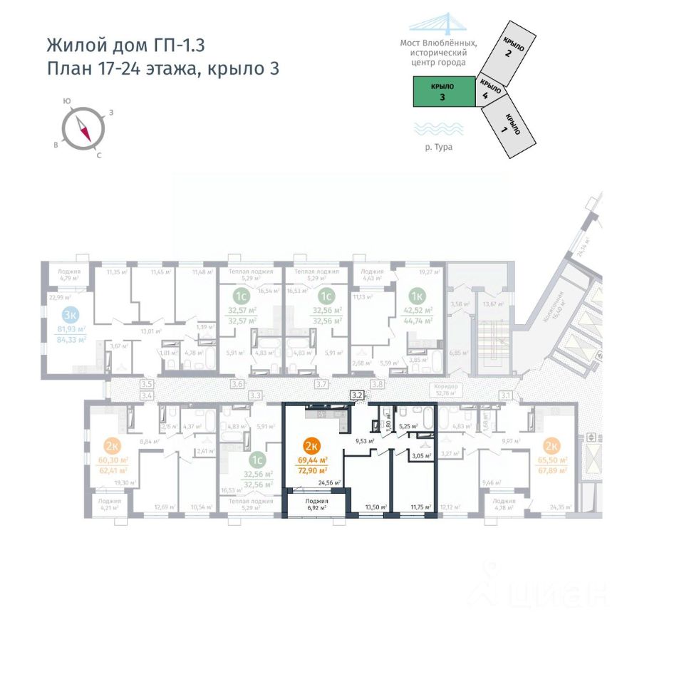 Предлагаем 2 - комнатную квартиру в доме ГП-1.3 общей площадью: 69,44 кв.м., с типом планировки: Кухня-гостиная. Комплекс расположен на территории бывшего завода "ДОК "Красный Октябрь. Это один из самых зеленых и чистых уголков города: здесь нет шумных магистралей и предприятий. До центра всего 2,5 км без мостов и путепроводов, а значит, вы можете спланировать время на дорогу с точностью до минуты. Дома стоят на высоком берегу Туры, на первой линии у воды. С территории ЖК хорошо просматриваются как панорама реки, так исторический центр, Мост Влюбленных и набережная. Проектирование ЖК выполнил архитектор Лазар Герич (Сербия). Из особых фишек проекта 9 лифтов на один дом, колясочные на каждом этаже, зоны ожидания и стойка консьержа в холле. Дворовая территория с игровыми и спортивными площадками - закрытая. Машино-места в комплексе бесплатные, общее число для дома первой очереди 642.