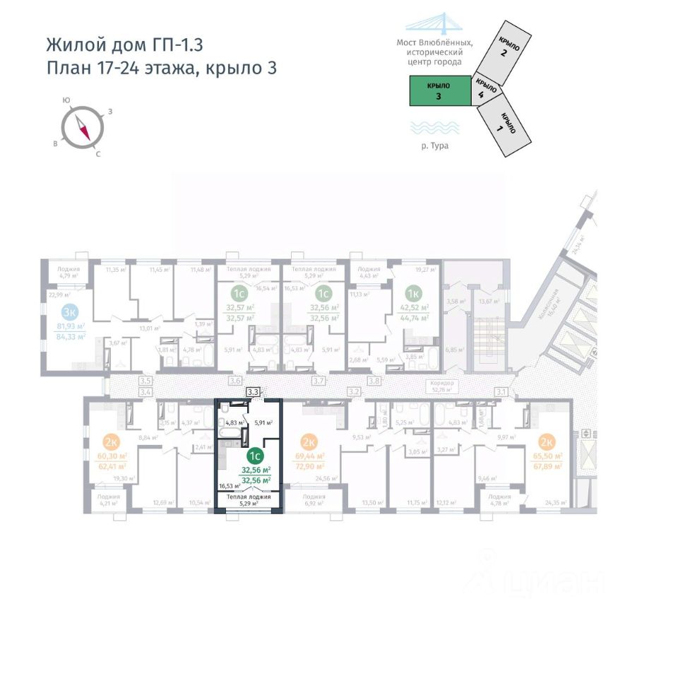 Предлагаем 1 - комнатную квартиру в доме ГП-1.3 общей площадью: 32,56 кв.м., с типом планировки: Студия. Комплекс расположен на территории бывшего завода "ДОК "Красный Октябрь. Это один из самых зеленых и чистых уголков города: здесь нет шумных магистралей и предприятий. До центра всего 2,5 км без мостов и путепроводов, а значит, вы можете спланировать время на дорогу с точностью до минуты. Дома стоят на высоком берегу Туры, на первой линии у воды. С территории ЖК хорошо просматриваются как панорама реки, так исторический центр, Мост Влюбленных и набережная. Проектирование ЖК выполнил архитектор Лазар Герич (Сербия). Из особых фишек проекта 9 лифтов на один дом, колясочные на каждом этаже, зоны ожидания и стойка консьержа в холле. Дворовая территория с игровыми и спортивными площадками - закрытая. Машино-места в комплексе бесплатные, общее число для дома первой очереди 642.