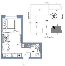 Продается 1комнатная квартира на 3 этаже от застройщика Страна Девелопмент. Площадь квартиры 26,67 кв. м.