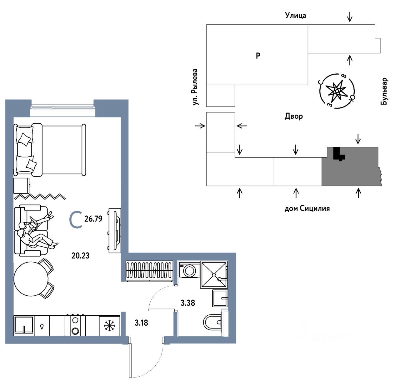 Продается 1комнатная квартира на 8 этаже от застройщика Страна Девелопмент. Площадь квартиры 26,79 кв. м.