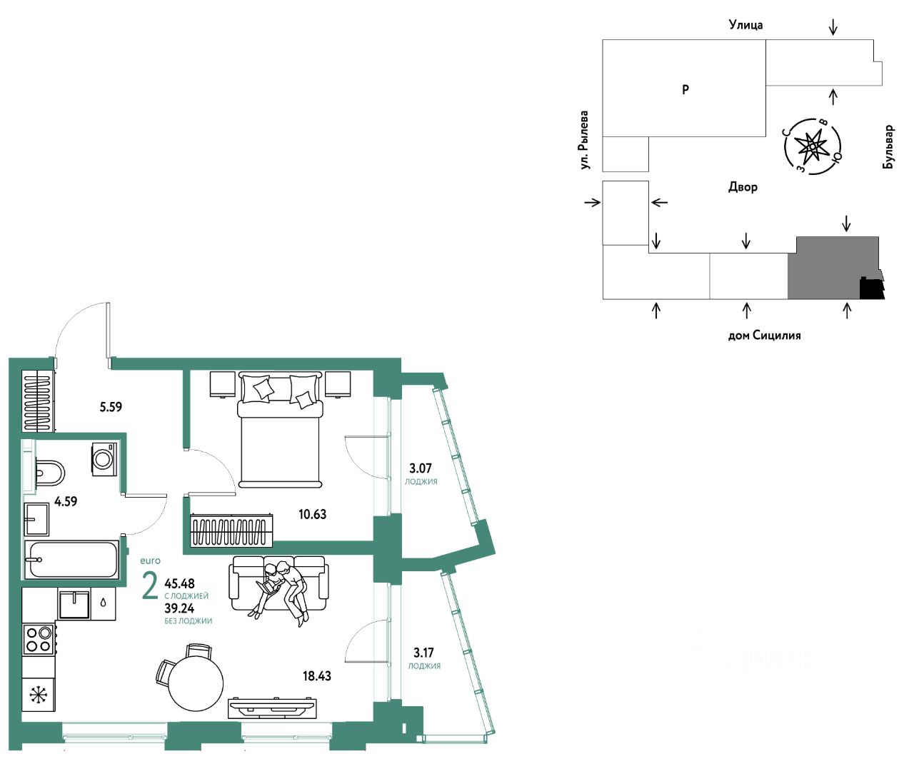 Продается 2комнатная квартира на 14 этаже от застройщика Страна Девелопмент. Площадь квартиры 45,48 кв. м.