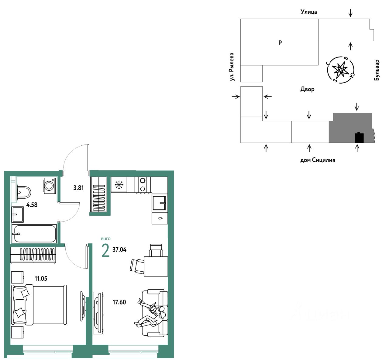 Продается 2комнатная квартира на 17 этаже от застройщика Страна Девелопмент. Площадь квартиры 37,04 кв. м.