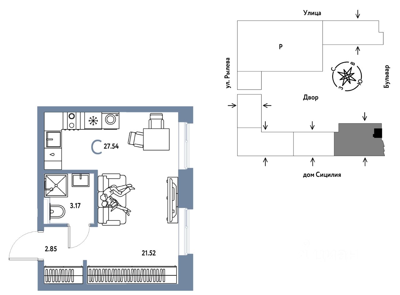 Продается 1комнатная квартира на 21 этаже от застройщика Страна Девелопмент. Площадь квартиры 27,54 кв. м.