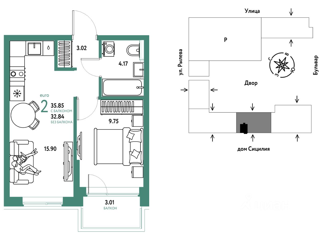 Продается 2комнатная квартира на 12 этаже от застройщика Страна Девелопмент. Площадь квартиры 35,85 кв. м.