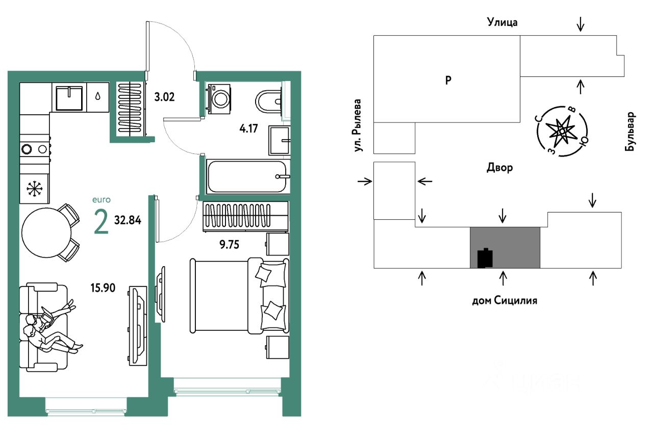 Продается 2комнатная квартира на 14 этаже от застройщика Страна Девелопмент. Площадь квартиры 32,84 кв. м.