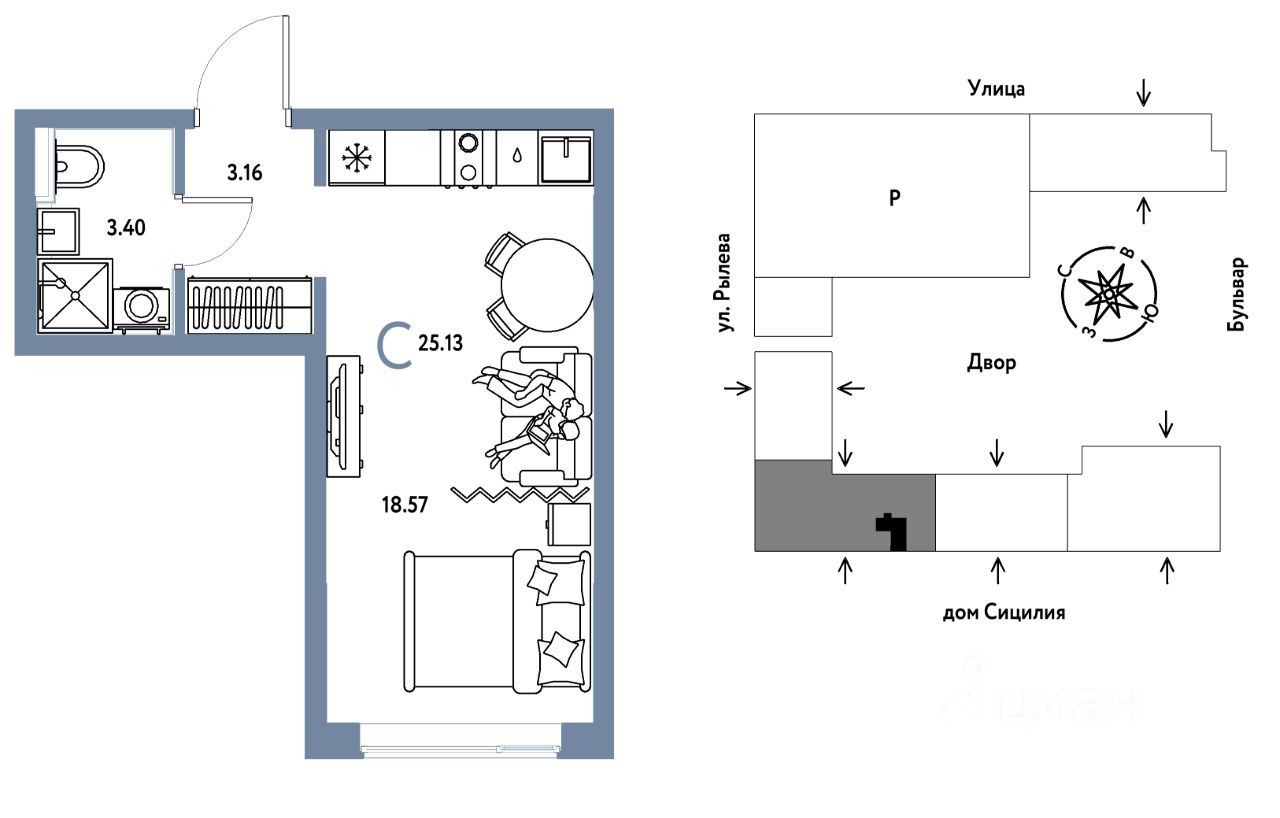Продается 1комнатная квартира на 13 этаже от застройщика Страна Девелопмент. Площадь квартиры 25,13 кв. м.