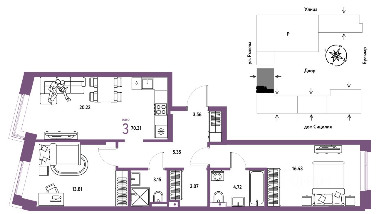 Продается 3комнатная квартира на 3 этаже от застройщика Страна Девелопмент. Площадь квартиры 70,31 кв. м.