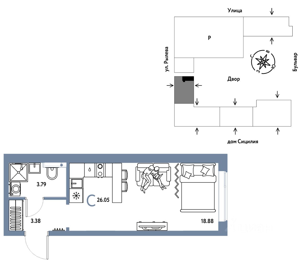 Продается 1комнатная квартира на 15 этаже от застройщика Страна Девелопмент. Площадь квартиры 26,05 кв. м.