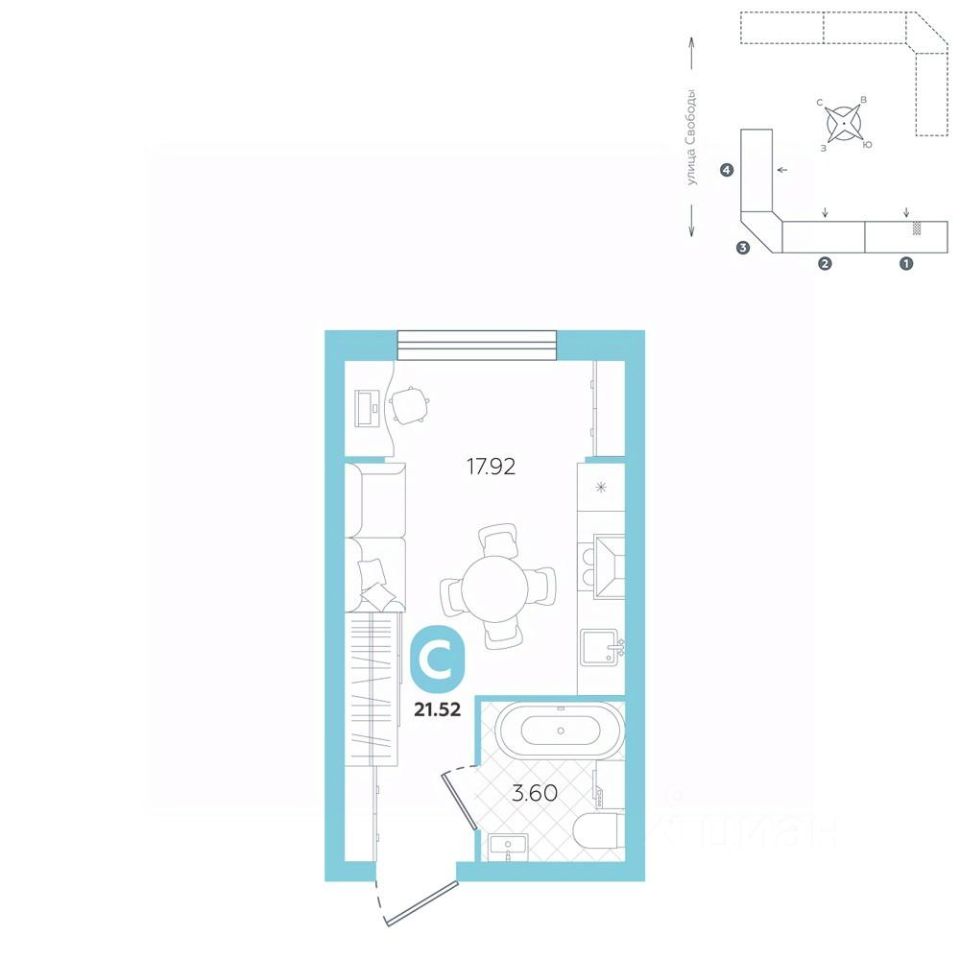 площадь квартиры - 21,52 кв.м