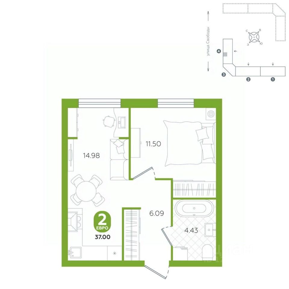 площадь квартиры - 37 кв.м