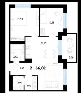 Планировка включает две спальни, гардеробную, два санузла и кухню-гостиную. Кладовка расположена на цокольном этаже.