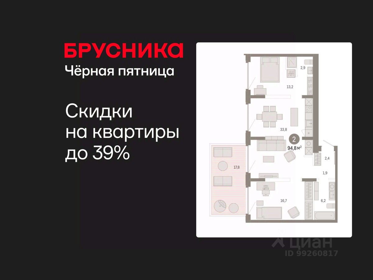 2-комн. квартира с предчистовой отделкой в ЖК "Зарека" на 2 этаже. Общая площадь: 94.77 кв.м. Высота потолков 2.7 м.