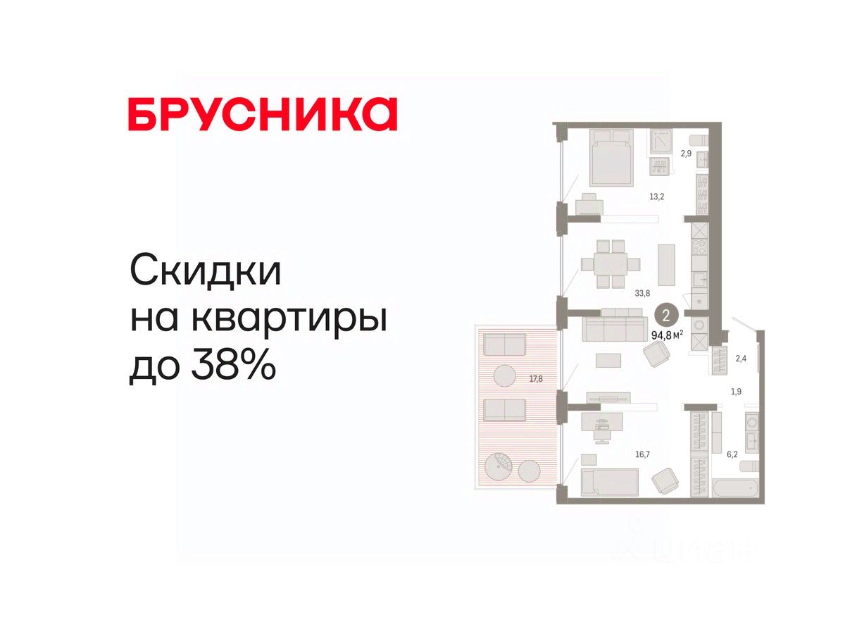 Просторная 2-комн. квартира с предчистовой отделкой в ЖК "Зарека" на 2 этаже. Общая площадь: 94.77 кв.м. Высота потолков 2.7 м.