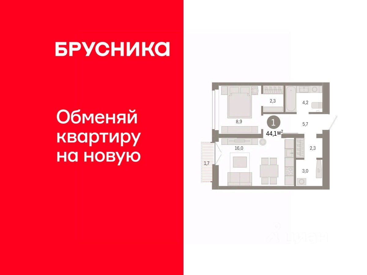 Однокомнатная квартира с предчистовой отделкой в ЖК "Республики 205" на 9 этаже. Общая площадь: 44.1 кв.м., жилая: 8.9 кв.м., площадь просторной кухни-гостиной: 16 кв.м. Все окна выходят на одну сторону. В квартире один балкон, один совмещенный санузел. Высота потолков 2.7 м.