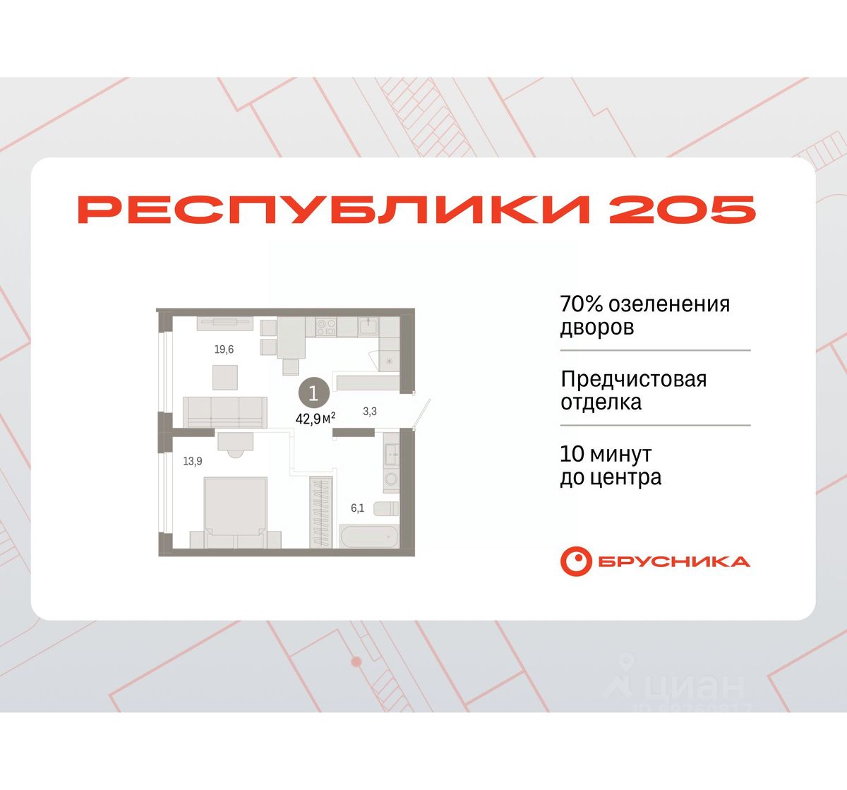Продается 1-комн. квартира с предчистовой отделкой в ЖК "Республики 205" на 1 этаже. Общая площадь: 42.91 кв.м., жилая: 13.9 кв.м., площадь просторной кухни-гостиной: 19.6 кв.м. Все окна выходят на одну сторону. В квартире один совмещенный санузел. Высота потолков 2.6 м.