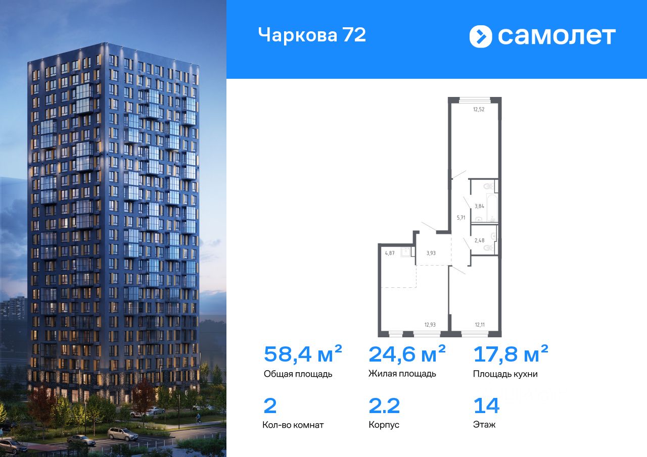 Строим кварталы для жизни с заботой о будущем. Предлагается 2-комнатная квартира комфорт-класса 58,39 кв.м в корпусе 2.2 на 14 этаже, в ЖК "Чаркова 72"
