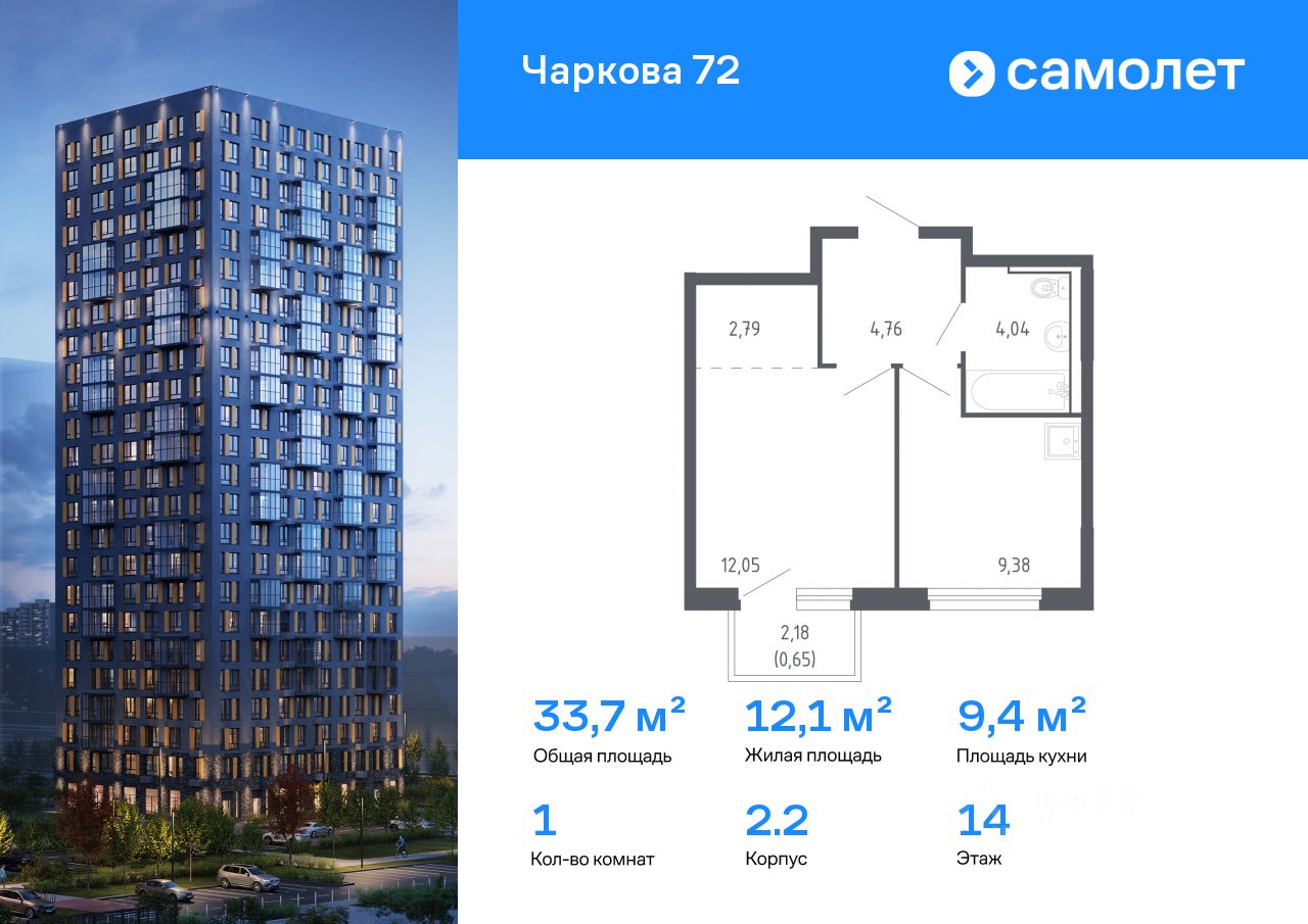 Строим кварталы для жизни с заботой о будущем. Предлагается 1-комнатная квартира комфорт-класса 33,67 кв.м в корпусе 2.2 на 14 этаже, в ЖК "Чаркова 72"