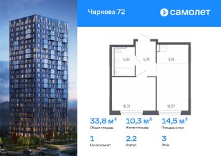 Предлагается 1-комнатная квартира комфорт-класса 33,81 кв.м в корпусе 2.2 на 3 этаже, в ЖК "Чаркова 72"