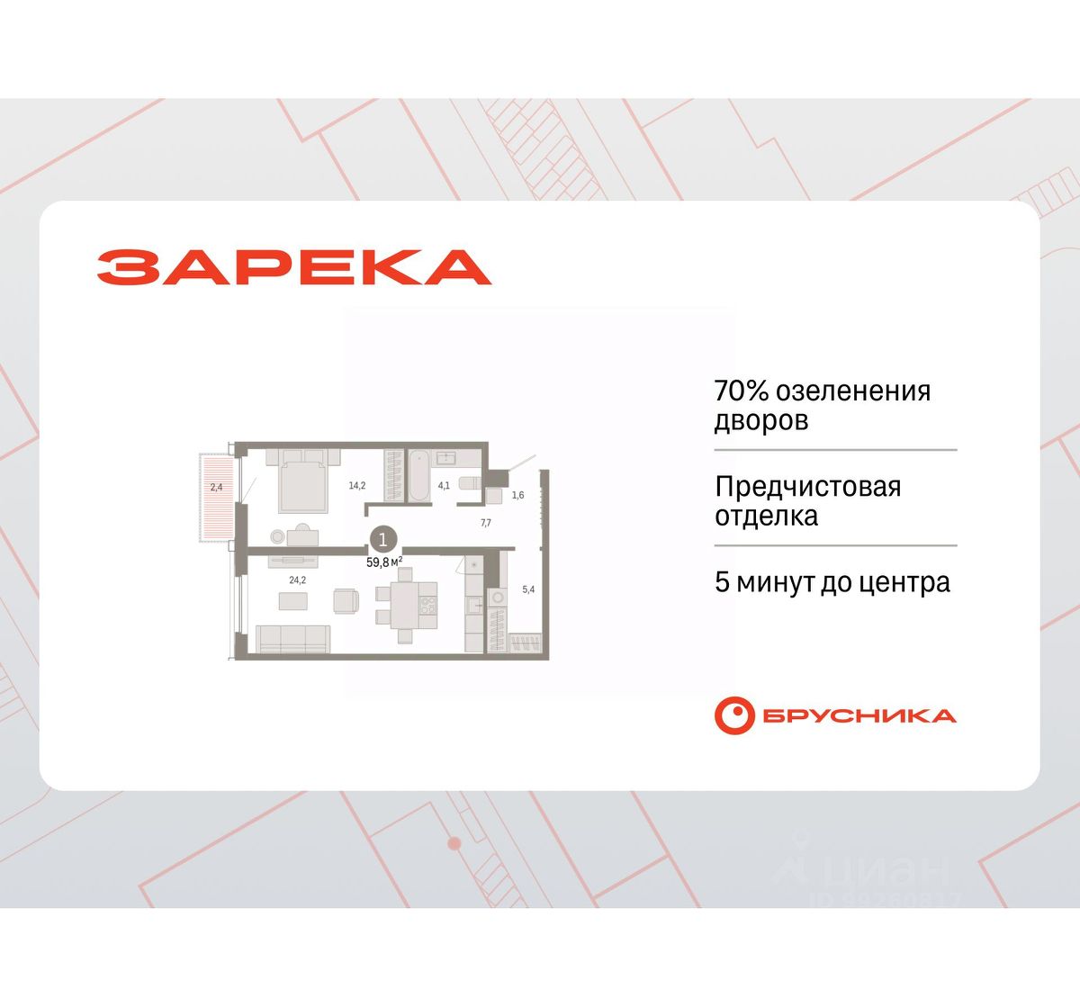 1-комн. квартира от застройщика с предчистовой отделкой в ЖК "Зарека" на 6 этаже. Общая площадь: 59.76 кв.м., жилая: 14.2 кв.м., площадь просторной кухни-гостиной: 24.2 кв.м. Все окна выходят на одну сторону. В квартире один балкон, один совмещенный санузел. Высота потолков 2.7 м.