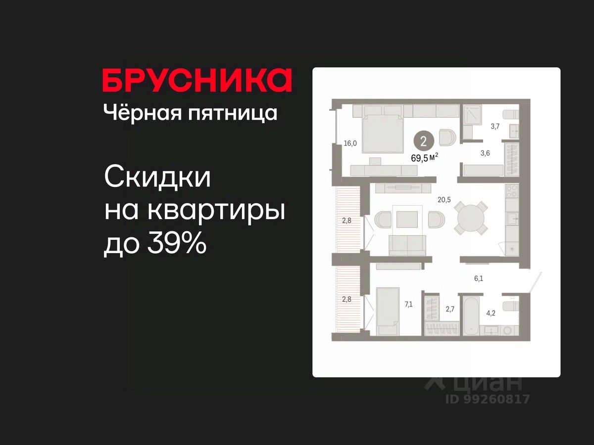 Продается 2-комн. квартира от застройщика с предчистовой отделкой в ЖК "Республики 205" на 3 этаже. Общая площадь: 69.47 кв.м., жилая: 23.1 кв.м., площадь просторной кухни-гостиной: 20.5 кв.м. Комнаты изолированные, все окна выходят на одну сторону. В квартире две лоджии, два совмещенных санузла. Высота потолков 2.7 м.