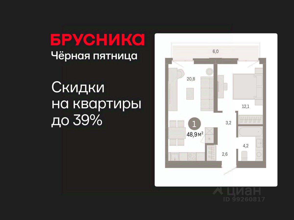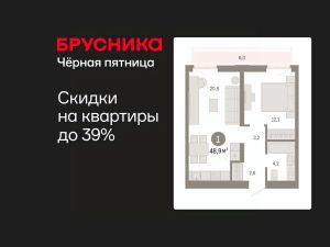 Однокомнатная квартира с предчистовой отделкой в ЖК "Республики 205" на 6 этаже. Общая площадь: 48.88 кв.м., жилая: 12.1 кв.м., площадь просторной кухни-гостиной: 20.8 кв.м. Все окна выходят на одну сторону. В квартире один балкон, один совмещенный санузел. Высота потолков 2.7 м.