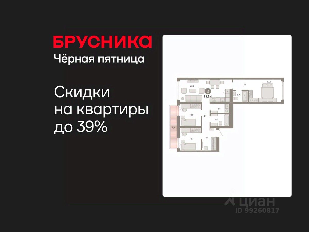Трехкомнатная квартира от застройщика с предчистовой отделкой в ЖК "Республики 205" на 6 этаже. Общая площадь: 88.32 кв.м., жилая: 29.4 кв.м., площадь просторной кухни-гостиной: 23.1 кв.м. Квартира - распашонка, без проходных комнат, окна выходят на paзные стороны дома. В квартире два балкона, два совмещенных санузла. Высота потолков 2.7 м.