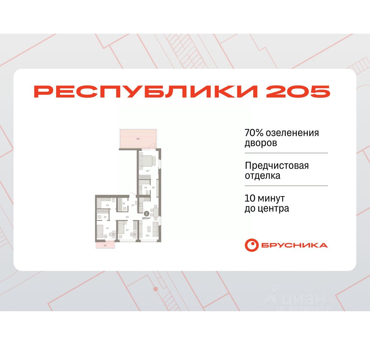 Просторная трехкомнатная квартира с предчистовой отделкой в ЖК "Республики 205" на 2 этаже. Общая площадь: 107.36 кв.м. Высота потолков 2.7 м.