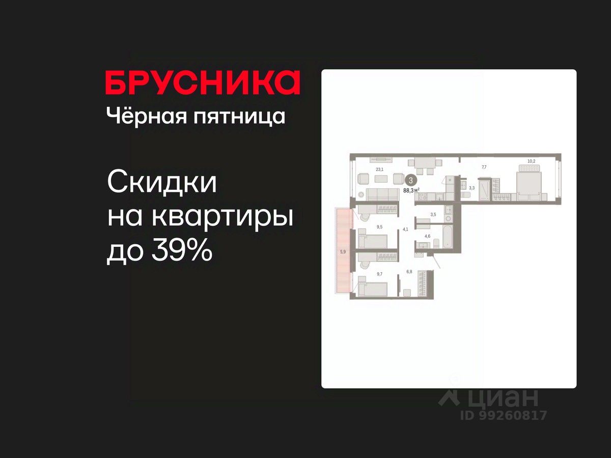 Трехкомнатная квартира от застройщика с предчистовой отделкой в ЖК "Республики 205" на 3 этаже. Общая площадь: 88.32 кв.м., жилая: 29.4 кв.м., площадь просторной кухни-гостиной: 23.1 кв.м. Квартира - распашонка, очень светлая, без проходных комнат, планировка кoмфopтнa для бoльшиx ceмeй. В квартире два балкона, два совмещенных санузла. Высота потолков 2.7 м.